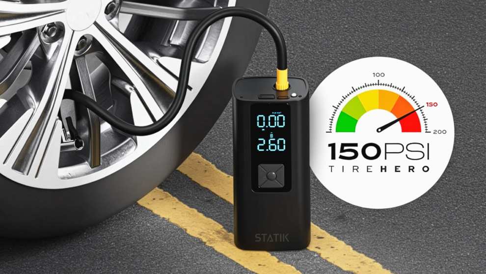 TireHero is a high-tech wireless air pump with a powerful 6000 mAh rechargeable battery and advanced compression technology that inflates low tires up to 150 PSI, getting you back on the road safely in minutes. It’s powerful, fast, and built to last.